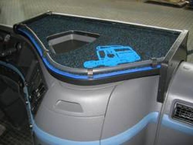 Typ FH12, FH13, E rok výroby 2008-> Odkládací stolek středový na přístrojovou desku Stolek je vyroben z dřevotřísky, tmavě polaminován, navrchu potažen tmavým…