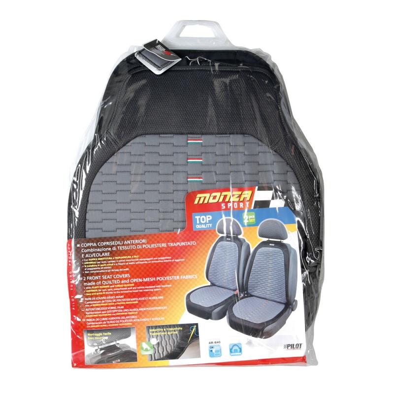 Potahy předních sedadel Monza od Italské firmy Lampa z prošívané polyesterové tkaniny s větracími otvory. Univerzální potahy pro vozidla vybavená opěrkami hlavy, díky inovativnímu systému zachycení za opěrky hlavy.