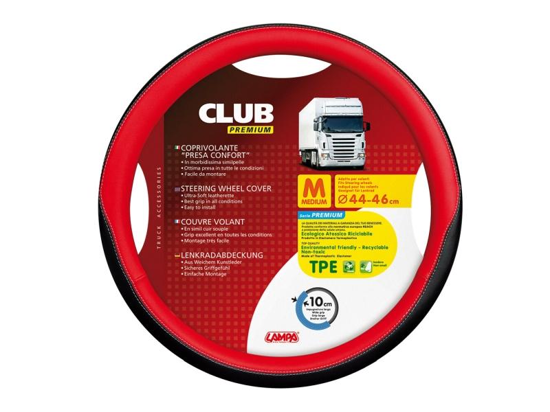 Potah na volant nákladního automobilu o průměru 44 - 46 cm velikost M, od Italské firmy LAMPA ve velmi pěkném a kvalitním provedení PREMIUM s označením CLUB Confort v červené barvě s černou hranou a prošitý nití.