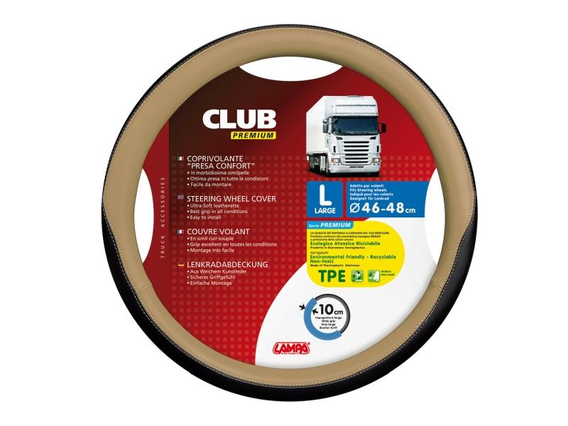 Potah na volant nákladního automobilu o průměru 46 - 48 cm velikost L, od Italské firmy LAMPA ve velmi pěkném a kvalitním provedení PREMIUM s označením CLUB Confort v béžové barvě s černou hranou a prošitý nití.