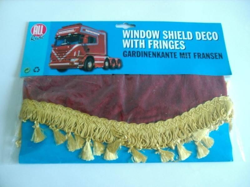 Dekorativní záclonka proti slunci na přední okno nákladního automobilu červená se zlatými střapci o délce 2,5m