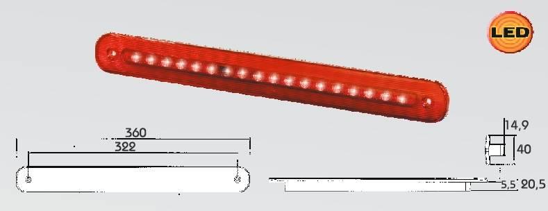 Brzdové světlo přídavné LED 12V Pro-Can XL červené vodotěsné nožnost montáže horizontálně i vertikálně kabel 0,5m LED 12V - 2,5W rozměr světla 252 x 22 x…