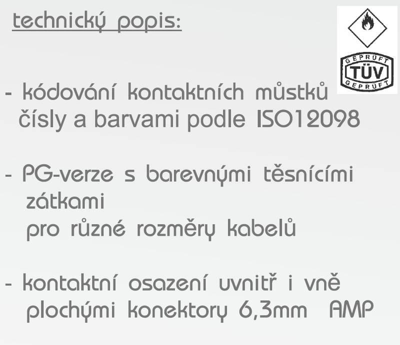 Krabice rozdělovače ADR vnější připojení PG vývodkami zkouška IP 54 technický popis : kodování kontaktních můstků čísly a barvami podle ISO 12098…