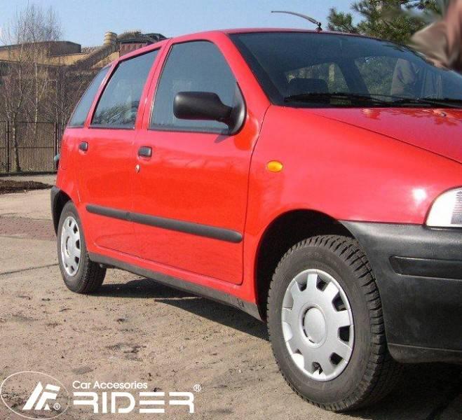 Ochranné černé gumoplastové lišty bočních dveří od výrobce RIDER pro vůz Fiat Punto I, roku výroby 1993 - 1999, sada čtyř kusů lišt dveří, dva kusy na přední dveře a dva kusy na zadní dveře vše v černém provedení.