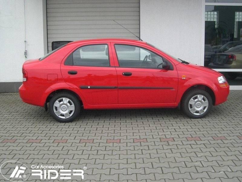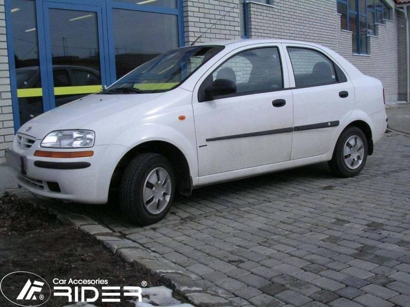 Ochranné černé gumoplastové lišty bočních dveří od výrobce RIDER pro vůz Daewoo Kalos, 4 dveře, roku výroby 2002 - 2005, sada čtyř kusů lišt dveří, dva kusy na přední dveře a dva kusy na zadní dveře vše v černém provedení.
