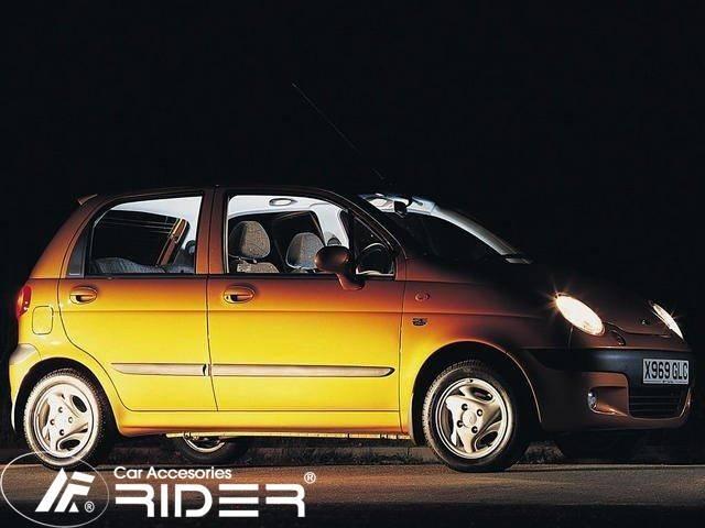 Ochranné černé gumoplastové lišty bočních dveří od výrobce RIDER pro vůz Daewoo Matiz, 5 dveří, roku výroby 1998 - 2003, sada čtyř kusů lišt dveří, dva kusy na přední dveře a dva kusy na zadní dveře vše v černém provedení.