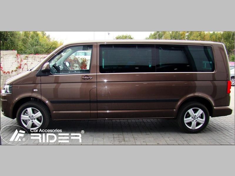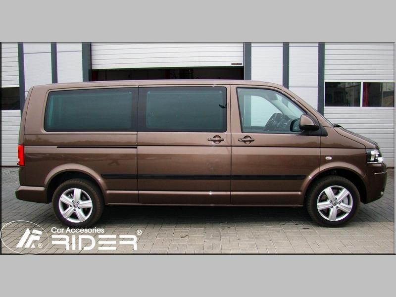 Ochranné černé gumoplastové lišty bočních dveří od výrobce RIDER pro vůz Volkswagen Transporter T5 Long, rok výroby 2003 - 2011, sada sedni kusů kusů lišt dveří vše v černém provedení.
