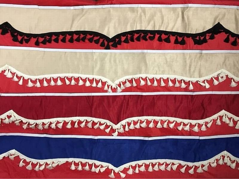 Dekorativní záclonka proti slunci na přední okno nákladního automobilu červená se zlatými střapci o délce 2,5m Upozornění : Výrobek nesmí být umístněn tak,…
