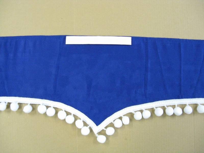 Dekorace čelního okna modrá s okrajem z bílých bambulek takzvaná bondura.