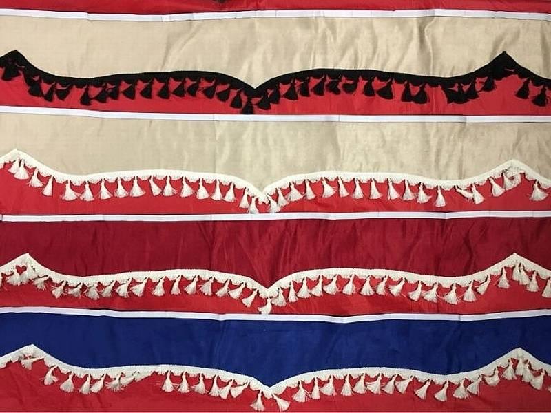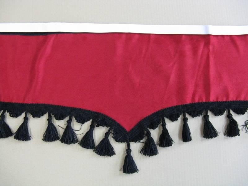 Dekorativní záclonka proti slunci na přední okno nákladního automobilu červená se zlatými střapci o délce 2,5m Upozornění : Výrobek nesmí být umístněn tak,…