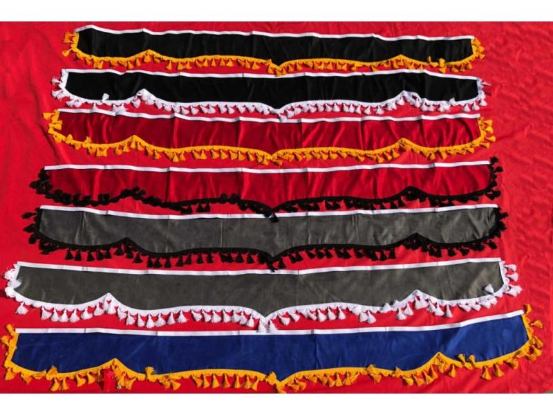 Dekorativní záclonka proti slunci na přední okno nákladního automobilu červená se zlatými střapci o délce 2,5m Upozornění : Výrobek nesmí být umístněn tak,…
