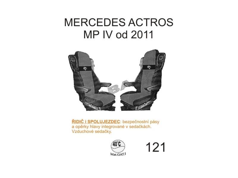 Autopotahy na sedačky nákladních automobilů vyrobené z pevnějšího materiálu menšestru, přesně kopírující sedadla vozů MERCEDES Actros MP IV od roku výroby 2011 ->, sedadlo řidiče i spolujezdce je vzduchové, bezpečnostní pás je integrovaný v sedačce, potah číslo 121.
