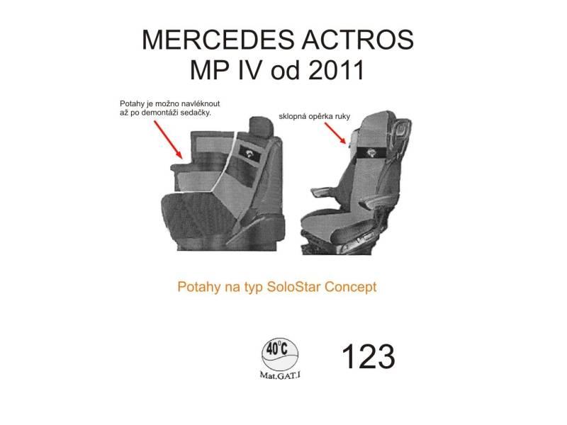 Autopotahy na sedačky nákladních automobilů vyrobené z pevnějšího materiálu menšestru, přesně kopírující sedadla vozů MERCEDES Actros MP IV SoloStar od roku výroby 2011 ->, sedadlo řidiče je vzduchové a sedadlo spolujezdce je pevné, potah číslo 123.