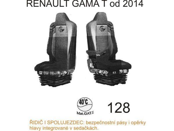 Autopotahy na sedačky nákladních automobilů vyrobené z pevnějšího materiálu menšestru, přesně kopírující sedadla vozů RENAULT Gamma T od roku výroby 2014 ->, na vzduchové sedačky a pásy integrované v sedačkách, potah číslo 128.