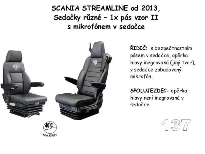 Autopotahy na sedačky nákladních automobilů vyrobené z pevnějšího materiálu menšestru, přesně kopírující sedadla vozů SCANIA R Streamline od roku výroby 2013 -> i na SCANIA S i R od 2017 ->, obě sedačky jsou vzduchové, bezpečností pás řidiče zabudovaný v sedačce, s i bez HANDSFREE sady, pás u spolujezdce na sloupku, růrné sedačky, potah číslo 137.
