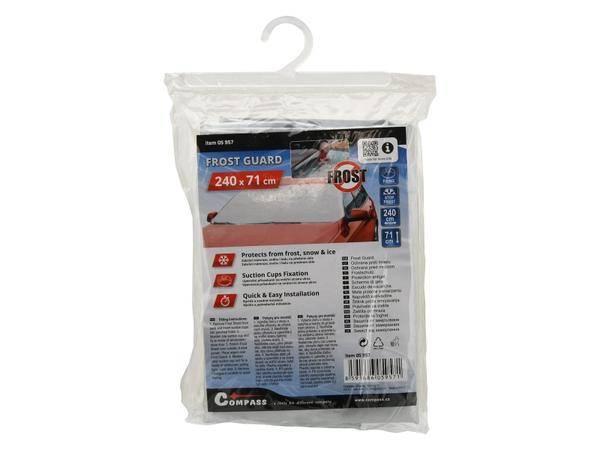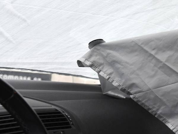 Clona je zhotovena z pevného materiálu, který je na vnější straně opatřen voděodolnou impregnací. Díky rozměrům 240 x 71 cm pohodlně zakryje přední sklo (u většiny běžných vozidel).