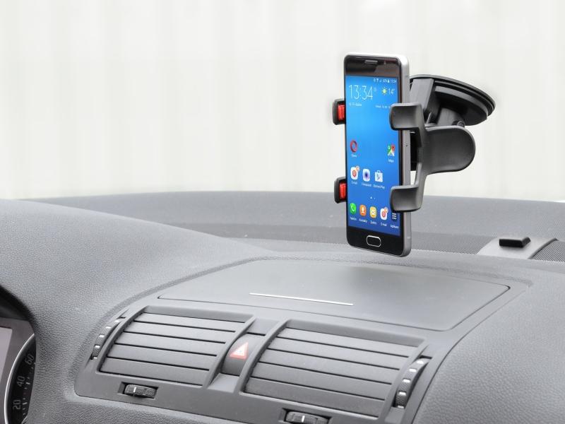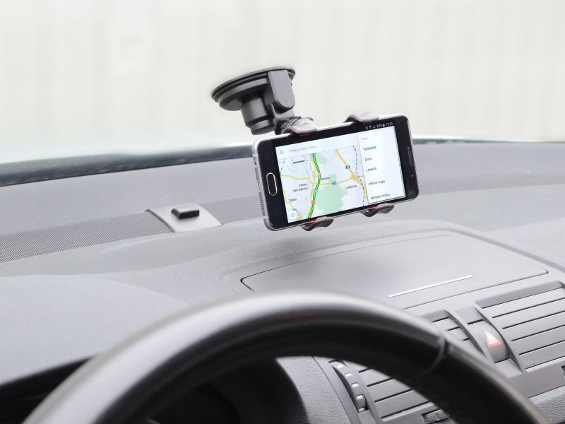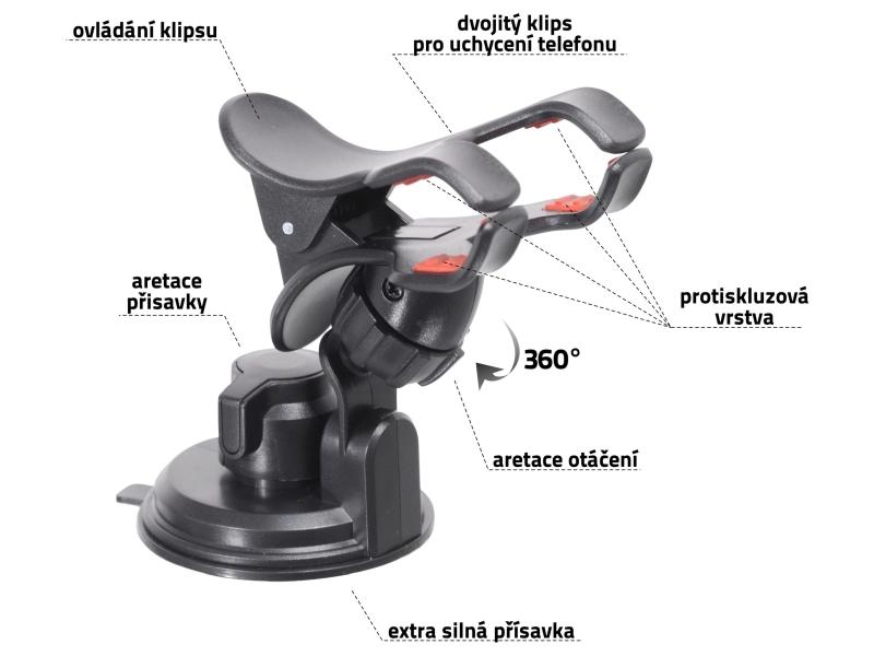 Držák telefonu s extra silnou přísavkou a klipsem pro uchycení telefonu či navigace až do šířky nebo výšky 9 cm.