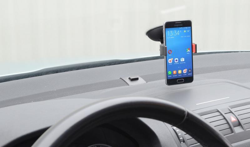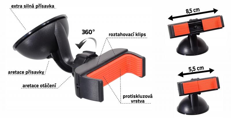 Držák telefonu s extra silnou přísavkou a klipsem pro uchycení telefonu šířky 5,5 – 8,5 cm.