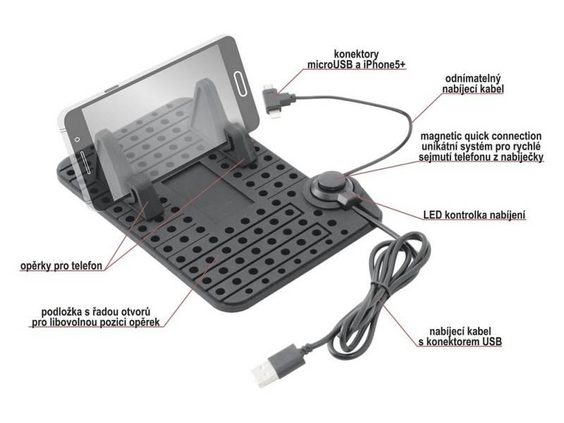 Podložka s držákem na telefon, vybavená nabíjecím USB kabelem s konektorem pro iPhone 5 a vyšší a zároveň s konektorem microUSB pro telefony Samsung, HTC, Huawei, Lenovo a dalších.