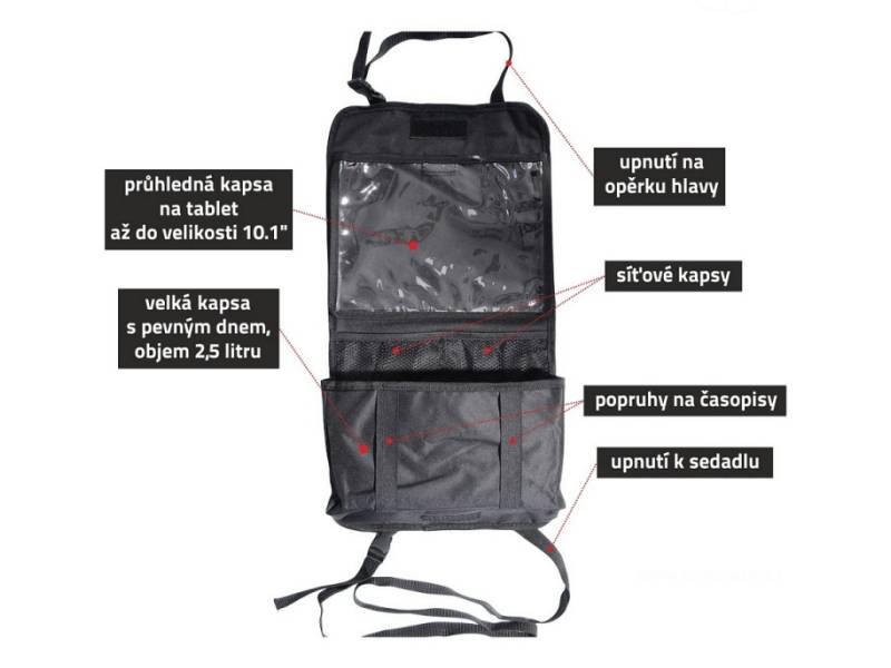 Organizér k připevnění na zadní stranu předního sedadla s možností upevnění tabletu.