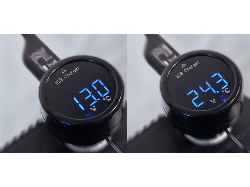 Displej na čelní straně adaptéru zobrazuje střídavě teplotu ve voze a aktuální napětí, dodávající autobaterie.