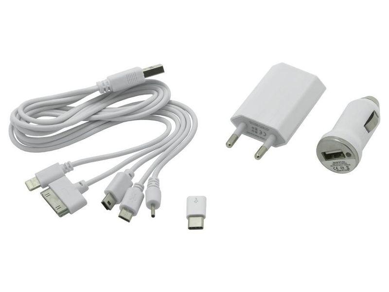 Balení obsahuje USB nabíječku s 12-24V napájením, USB nabíjecí adaptér 230V, propojovací kabel s integrovanými konektory (iPhone 4, iPhone 5-6-7-8-X, Nokia 2 mm, Mini USB a Micro USB s redukcí na USB-C)
