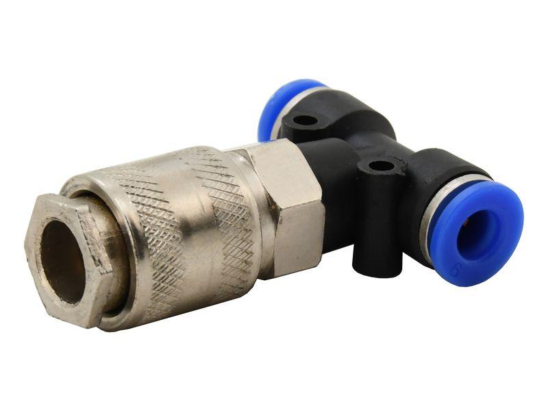 T Adaptér je určen pro připojení k 6 mm rozvodu stlačeného vzduchu a k připojení ke konci kroucené hadice pomocí rychlospojky.