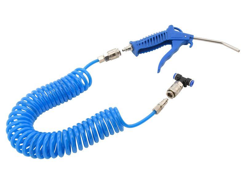 Vzduchová pistole v sadě s kroucenou modrou hadicí o délce 5 metrů a T adaptérem na plastové potrubí 6 mm..