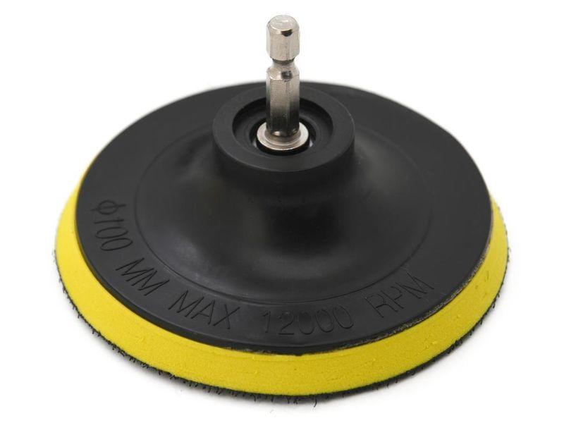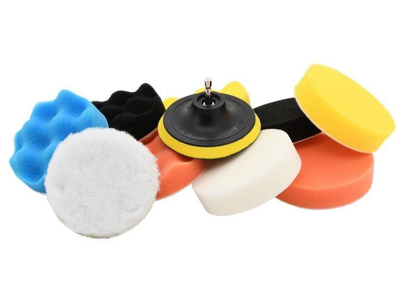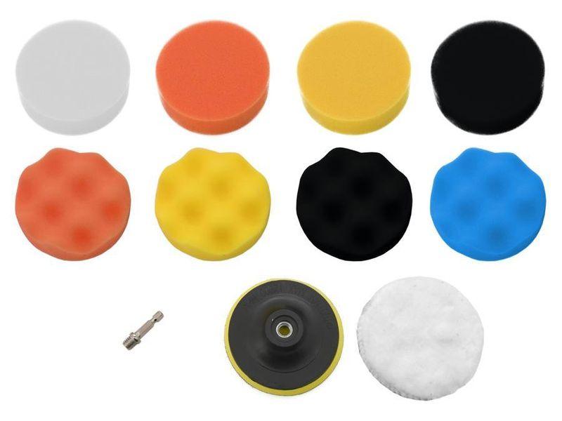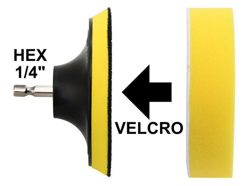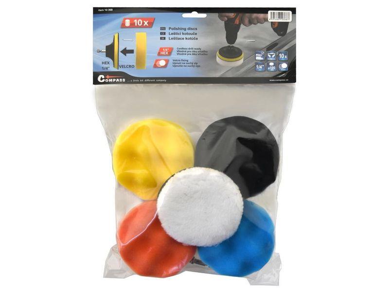 Součástí balení je několik kusů pěnových kotoučů různých tvrdostí, finišovací leštící kotouč a unášecí disk s HEX stopkou 1/4" určené k uchycení do vrtačky. Kotouče lze snadno přichytit na unašecí disk pomocí suchého zipu.