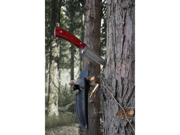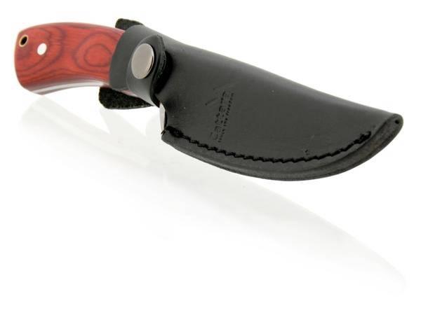 Rukojeť je osazena precizně opracovanými střenkami z vyřezávaného Pakkawood červené barvy, nůž perfektně padne do ruky a je opatřen zarážkou chránící nositele před pořezáním.