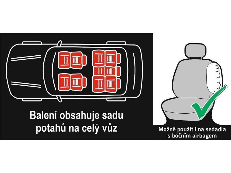 Balení obsahuje potah pro sedadlo a opěrku řidiče, potah pro sedadlo a opěrku spolujezdce, potah zadní nedělitelné sedačky a 5x potah pro hlavovou opěrku.