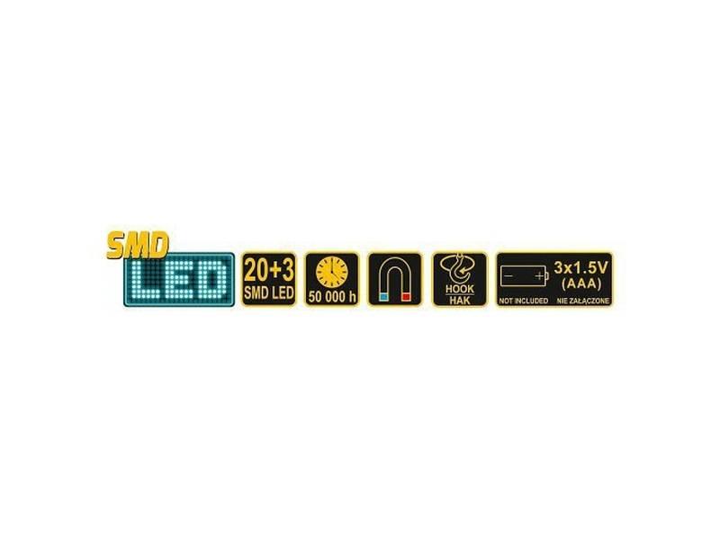 Poskytuje dva režimy světla - stálé bílé rozptylové světlo 20x LED a stálé bílé bodové světlo 3x LED.