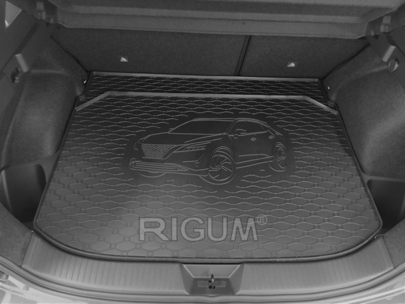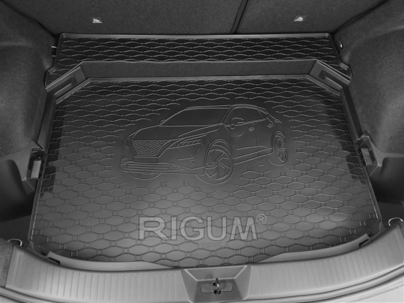Gumový koberec do kufru (gumová vana do zavazadlového prostoru) vozu Nissan Qashqai, od roku výroby 2022 ->, pro horní i dolní i provedení bez mezipodlahy pozici v černém protiskluzovém provedení od českého výrobce Rigum s.r.o., který přesně kopíruje kufr Vašeho vozu.
