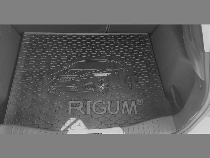 Gumový koberec do kufru neboli gumová vana do zavazadlového prostoru vozu Ford Focus hatchback, od roku výroby 2011 ->, s dojezdovým kolem v černém protiskluzovém provedení do České firmy Rigum s.r.o., která přesně kopíruje kufr Vašeho vozu.