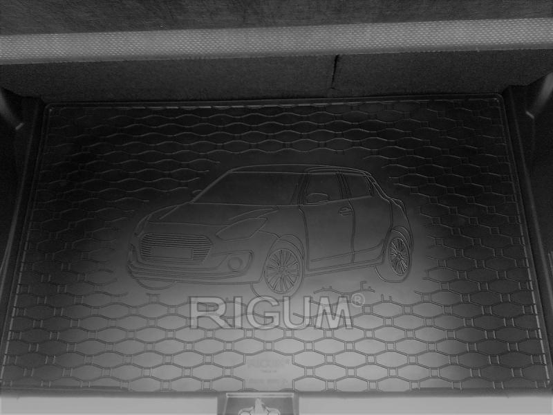 Gumový koberec do kufru neboli gumová vana do zavazadlového prostoru vozu Suzuki Swift Hackback, od roku výroby 2017 ->, v černém protiskluzovém provedení do České firmy Rigum s.r.o., která přesně kopíruje kufr Vašeho vozu.