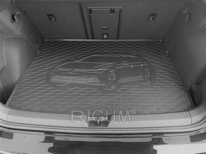 Gumový koberec do kufru (gumová vana do zavazadlového prostoru) vozu Volkswagen Golf VIII hatchback, provrdení pro horní kufr, od roku výroby 2020 ->, v černém protiskluzovém provedení do českého výrobce Rigum s.r.o., který přesně kopíruje kufr Vašeho vozu.