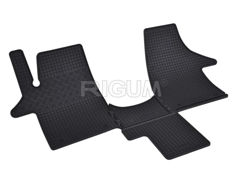 Gumové přesné podlahové koberce pod nohy pasažérů, které jsou svým tvarem přizpůsobeny do interiéru vozu Volkswagen Transporter T5 Multivan, od roku výroby 2003 ->, od české firmy Rigum které zabraňují namočení koberců interiéru od mokrých bot nebo bot od sněhu a jsou vyrobené z kvalitní gumové směsi.