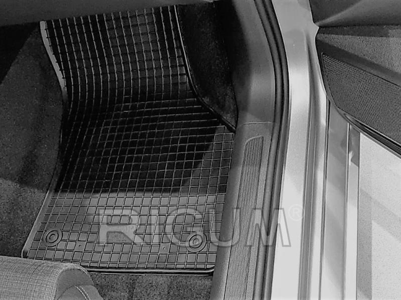 Gumové přesné podlahové koberce pod nohy pasažérů, které jsou svým tvarem přizpůsobeny do interiéru vozu Volkswagen Passat B8, od roku výroby 2019 ->, od české firmy Rigum které zabraňují namočení koberců interiéru od mokrých bot nebo bot od sněhu a jsou vyrobené z kvalitní gumové směsi.