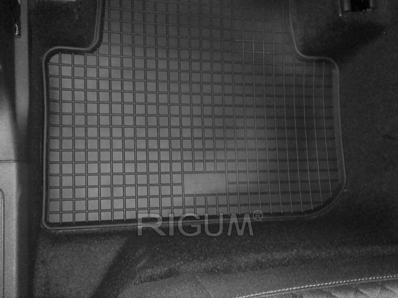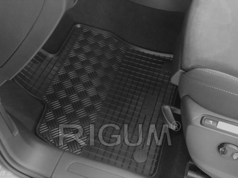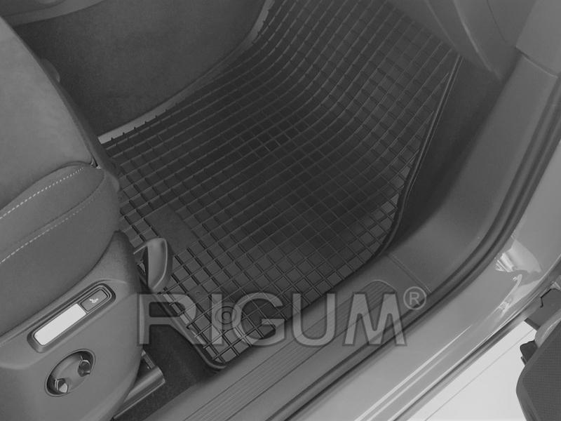 Gumové přesné podlahové koberce pod nohy pasažérů, které jsou svým tvarem přizpůsobeny do interiéru vozu Volkswagen Tiguan, od roku výroby 2020 ->, od české firmy Rigum které zabraňují namočení koberců interiéru od mokrých bot nebo bot od sněhu a jsou vyrobené z kvalitní gumové směsi.