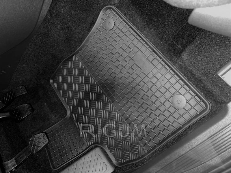 Gumové přesné podlahové koberce pod nohy pasažérů, které jsou svým tvarem přizpůsobeny do interiéru vozu Volkswagen Caddy první řada seadel 2 místa, od roku výroby 2021 ->, od české firmy Rigum které zabraňují namočení koberců interiéru od mokrých bot nebo bot od sněhu a jsou vyrobené z kvalitní gumové směsi.