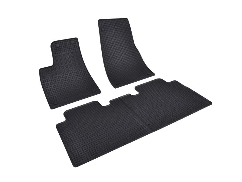 Gumové koberce do vnitřního prostoru vozu Tesla X, od roku výroby 2015 ->, sada obsahuje čtyři kusy koberců, dva kusy přední a dva kusy zadní v černém protiskluzovém provedení do České firmy Rigum s.r.o., která přesně kopíruje prostor Vašeho vozu.