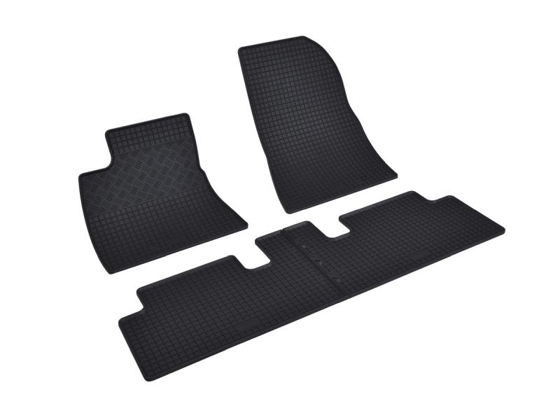Gumové koberce do vnitřního prostoru vozu Tesla Model 3, od roku výroby 2017 ->, sada obsahuje čtyři kusy koberců, dva kusy přední a dva kusy zadní v černém protiskluzovém provedení do České firmy Rigum s.r.o., která přesně kopíruje prostor Vašeho vozu.