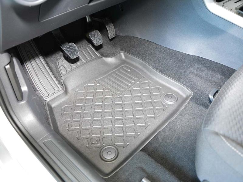Gumoplastové 3D přesné podlahové koberce ve tvaru vaničky pod nohy pasažérů na vůz Škoda Fabia IV Hatchback, 5 dveří , od roku výroby 09.2021 ->, od polské firmy Aristar, které zabraňují namočení koberců interiéru od mokrých bot nebo bot od sněhu a jsou vyrobené ze stejného materiálu jako vany do kufru od stejnojmenné firmy.