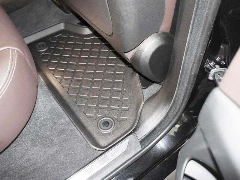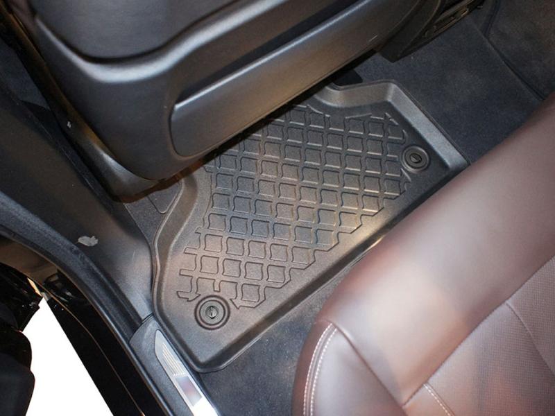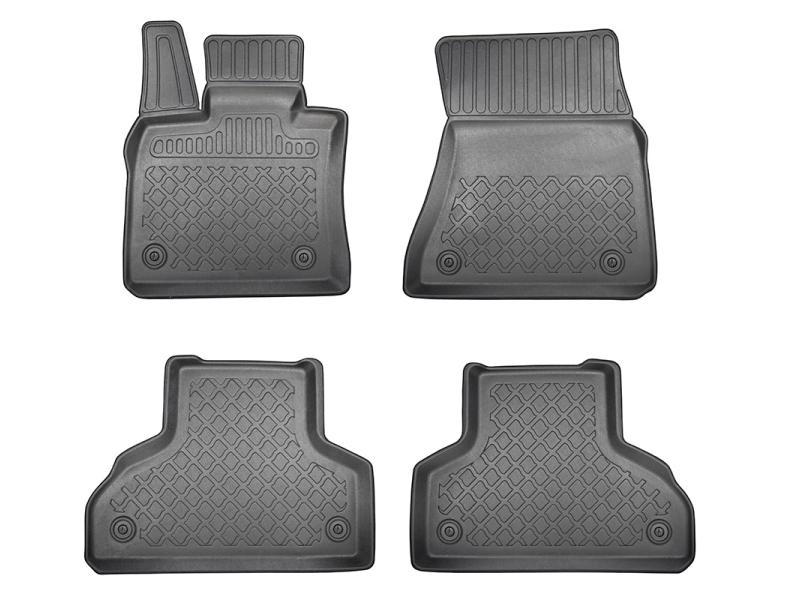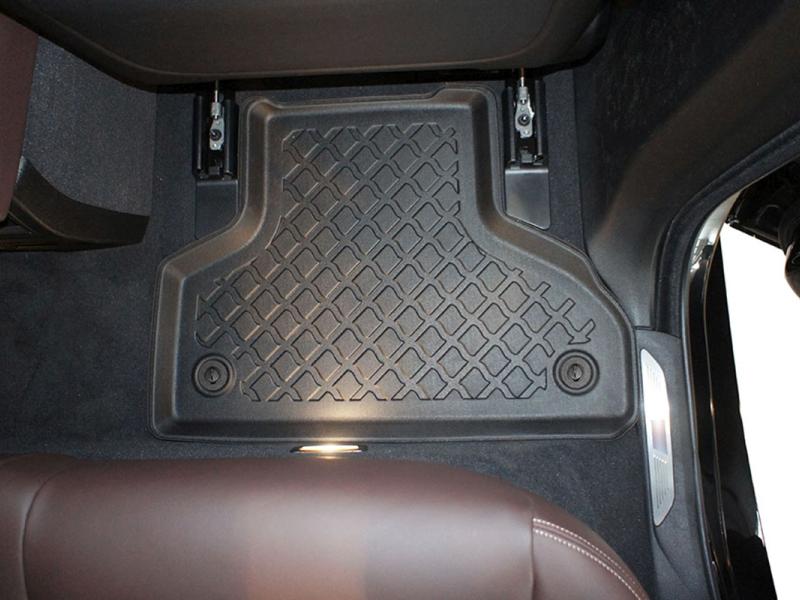 Gumoplastové 3D přesné podlahové koberce ve tvaru vaničky pod nohy pasažérů na vůz BMW X6 (F16) SUV 5 míst, rok výroby 11.2014 - 10.2019, pro dvě řady sedaček od polské firmy Aristar, které zabraňují namočení koberců interiéru od mokrých bot nebo bot od sněhu a jsou vyrobené ze stejného materiálu jako vany do kufru od stejnojmenné firmy.