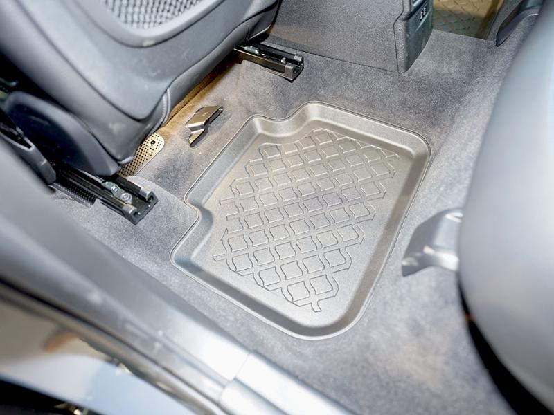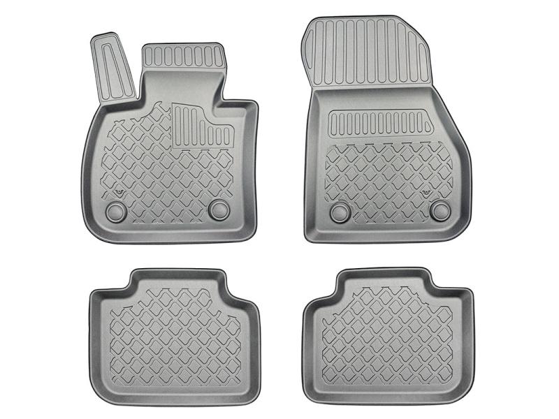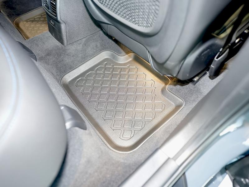 Gumoplastové 3D přesné podlahové koberce ve tvaru vaničky pod nohy pasažérů na vůz BMW 2 (U06) Active Tourer Van, od roku výroby 11.2021 ->, od polské firmy Aristar, které zabraňují namočení koberců interiéru od mokrých bot nebo bot od sněhu a jsou vyrobené ze stejného materiálu jako vany do kufru od stejnojmenné firmy.