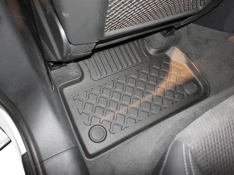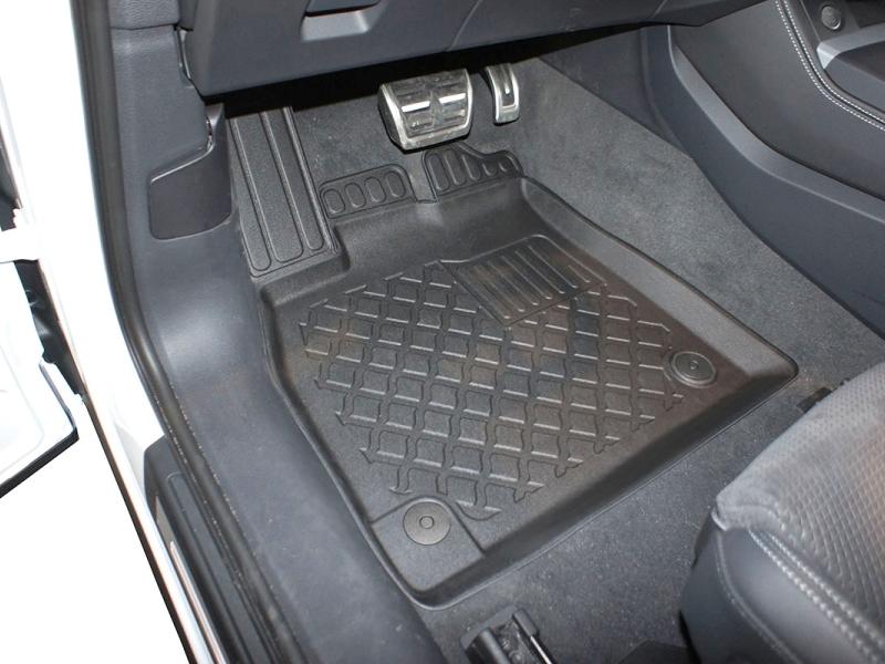 Gumoplastové 3D přesné podlahové koberce ve tvaru vaničky pod nohy pasažérů na vůz Audi Q5 II (FY), Sportback SUV 5 dveří, od roku výroby 03.2021 ->, od polské firmy Aristar, které zabraňují namočení koberců interiéru od mokrých bot nebo bot od sněhu a jsou vyrobené ze stejného materiálu jako vany do kufru od stejnojmenné firmy.