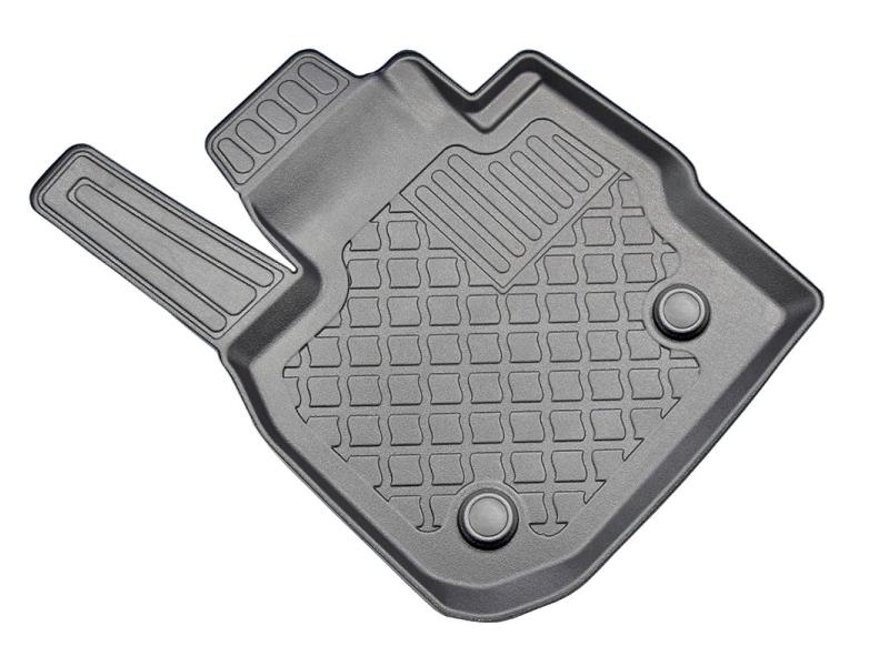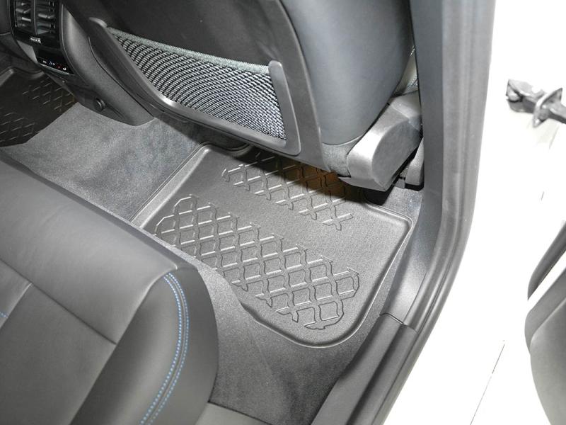 Gumoplastové 3D přesné podlahové koberce ve tvaru vaničky pod nohy pasažérů na vůz BMW i3 (G08) elektrické SUV, od roku výroby 01.2021 ->, od polské firmy Aristar, které zabraňují namočení koberců interiéru od mokrých bot nebo bot od sněhu a jsou vyrobené ze stejného materiálu jako vany do kufru od stejnojmenné firmy.