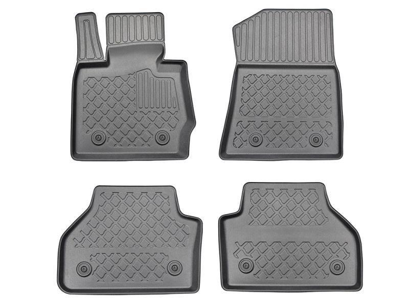 Gumoplastové 3D přesné podlahové koberce ve tvaru vaničky pod nohy pasažérů na vůz BMW X3 F25 SUV i BMW X4 F26 SUV 5 dveří, od roku výroby 11.2010 - 2017, od polské firmy Aristar, které zabraňují namočení koberců interiéru od mokrých bot nebo bot od sněhu a jsou vyrobené ze stejného materiálu jako vany do kufru od stejnojmenné firmy.