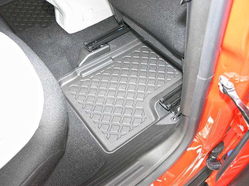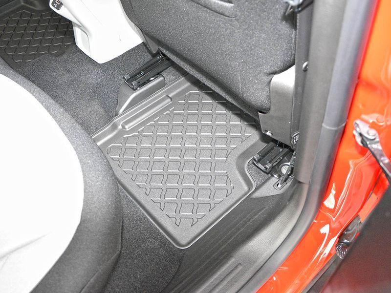 Gumoplastové 3D přesné podlahové koberce ve tvaru vaničky pod nohy pasažérů na vůz Jeep Renegade e-Hybrid, SUV, 5 dveří od roku výroby 02.2022 ->, ne pro 4ex Plung-in Hybrid, od polské firmy Aristar, které zabraňují namočení koberců interiéru od mokrých bot nebo bot od sněhu a jsou vyrobené ze stejného materiálu jako vany do kufru od stejnojmenné firmy.