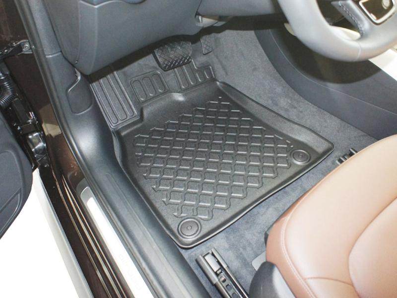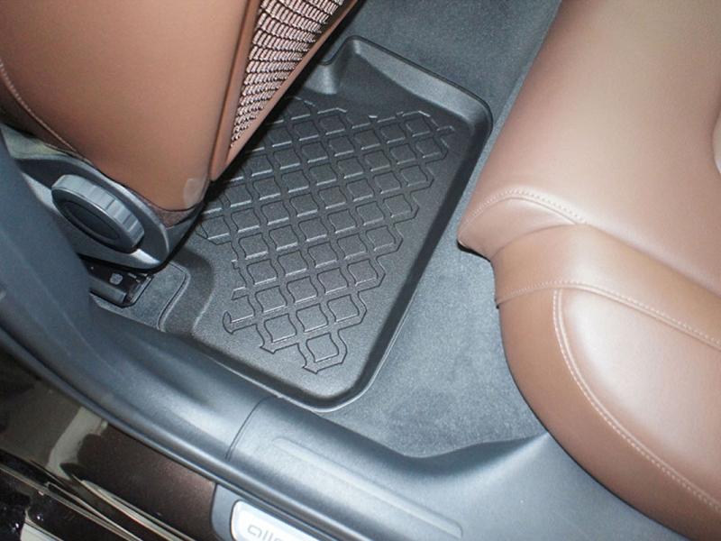 Gumoplastové 3D přesné podlahové koberce ve tvaru vaničky pod nohy pasažérů na vůz Audi A4 (B8) Avant, 5 míst, rok výroby 04.2008 - 10.2015, od polské firmy Aristar, které zabraňují namočení koberců interiéru od mokrých bot nebo bot od sněhu a jsou vyrobené ze stejného materiálu jako vany do kufru od stejnojmenné firmy.